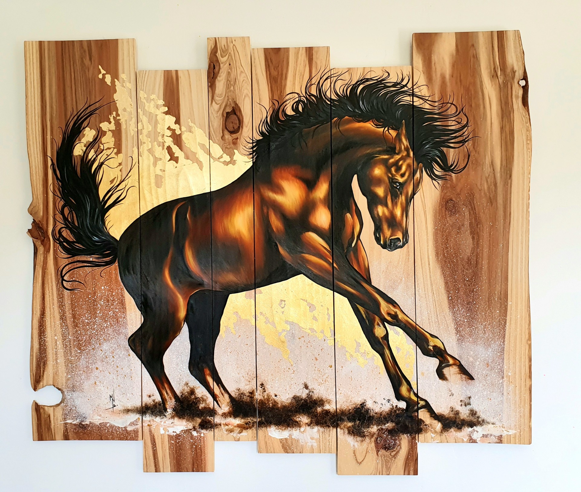 Matériaux: bois de séquoïa, peinture acrylique, feuille à dorer