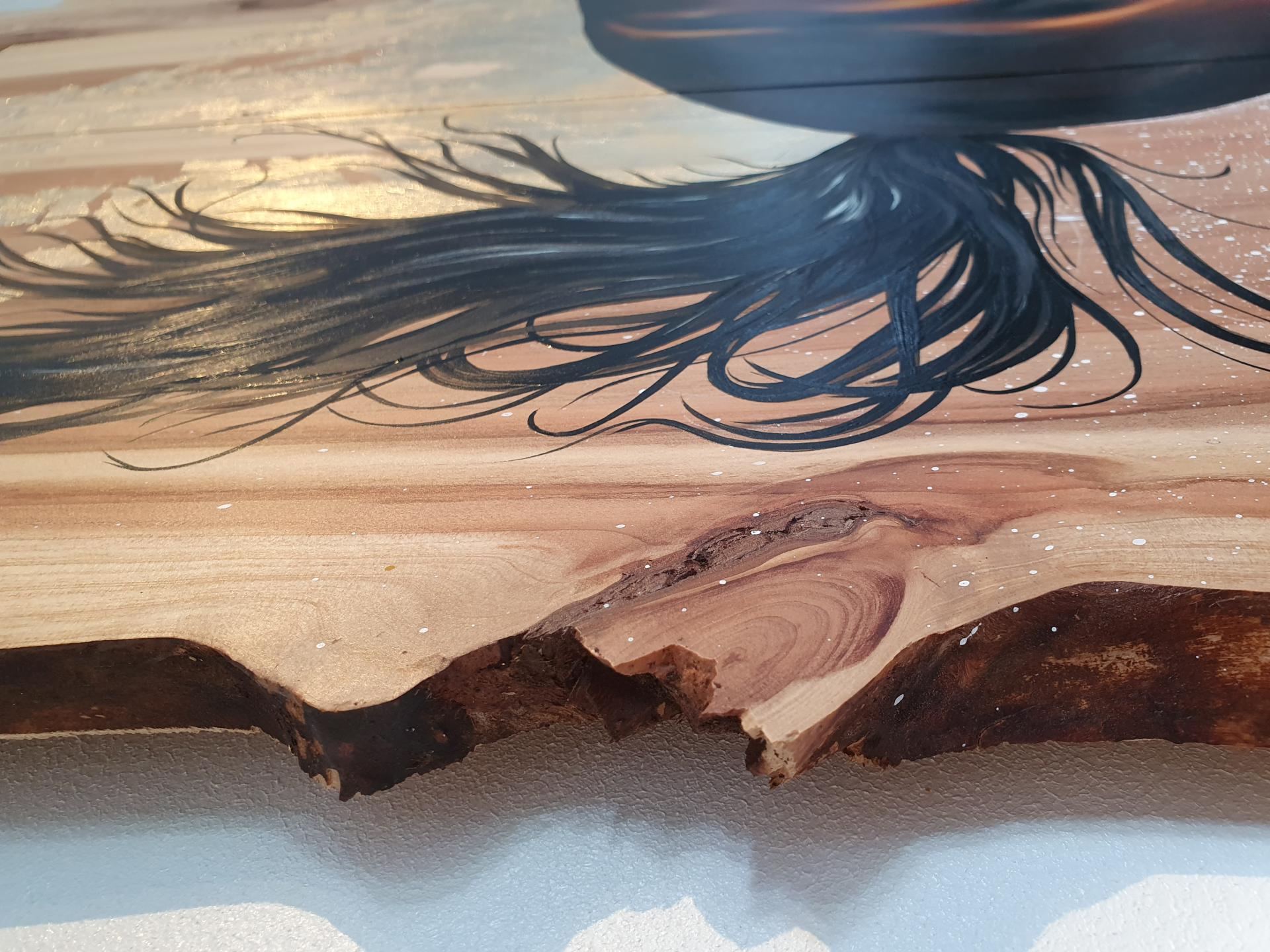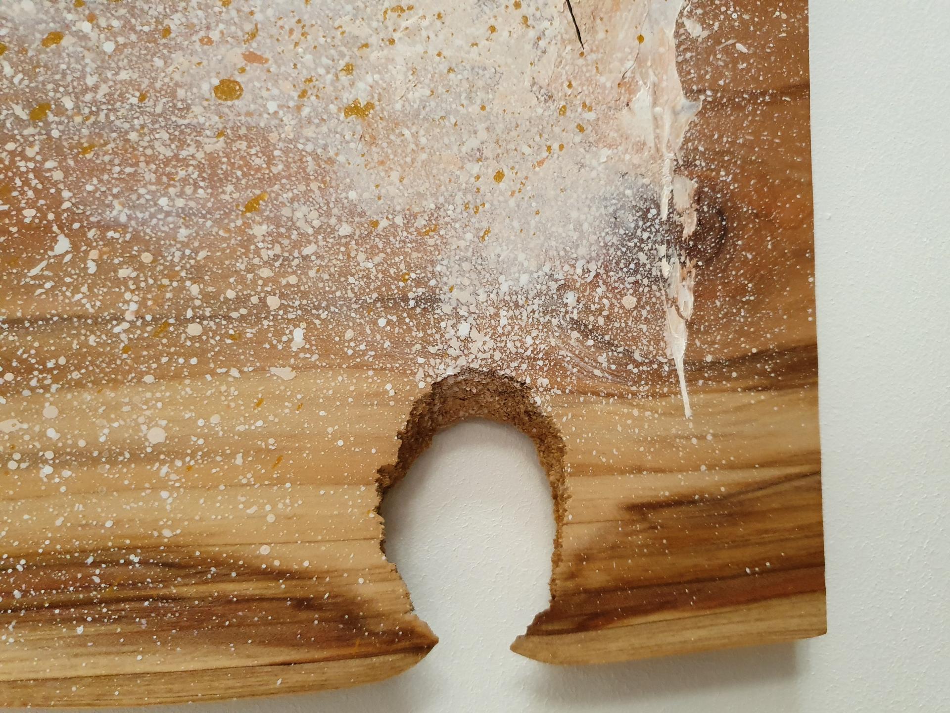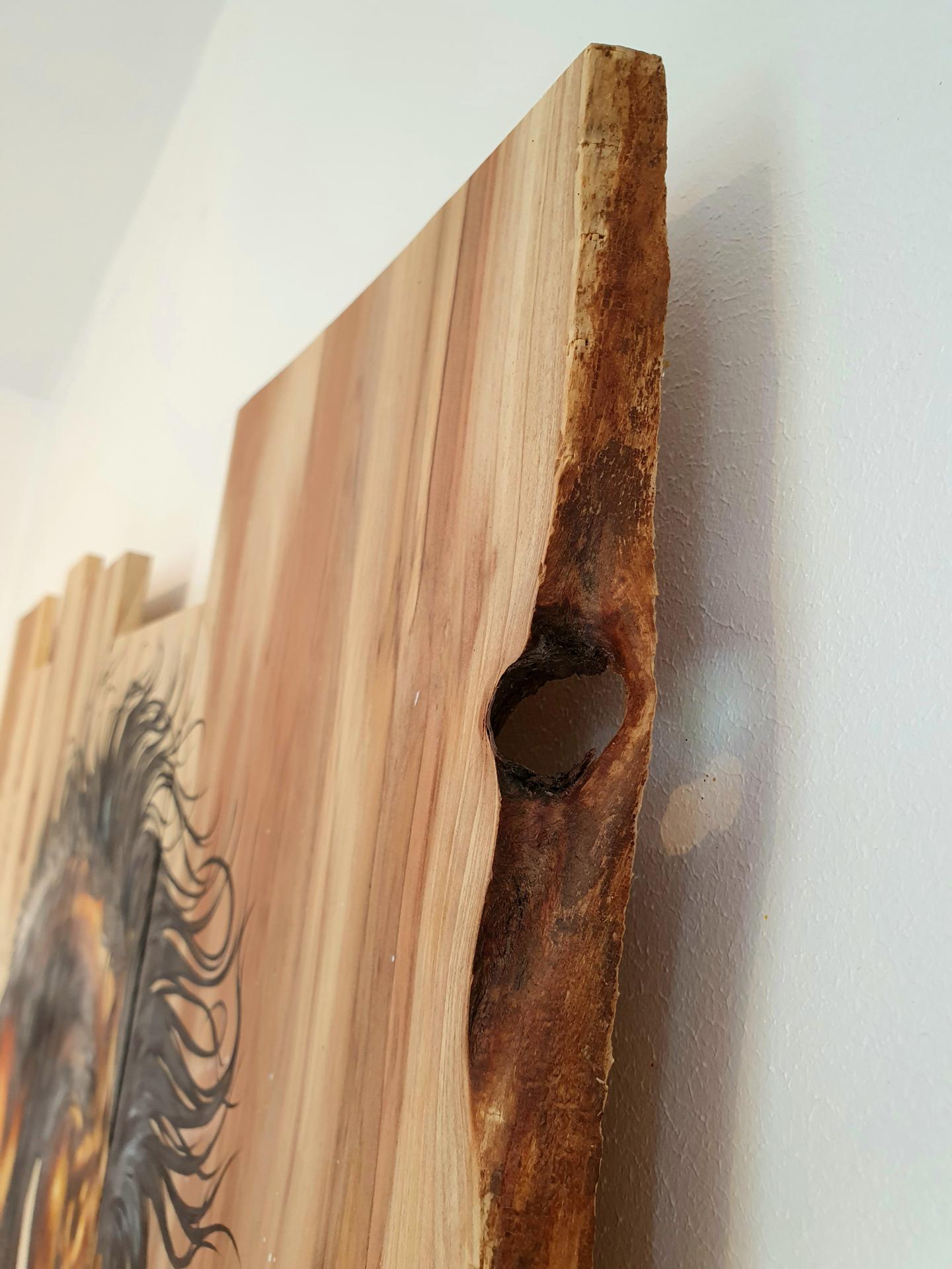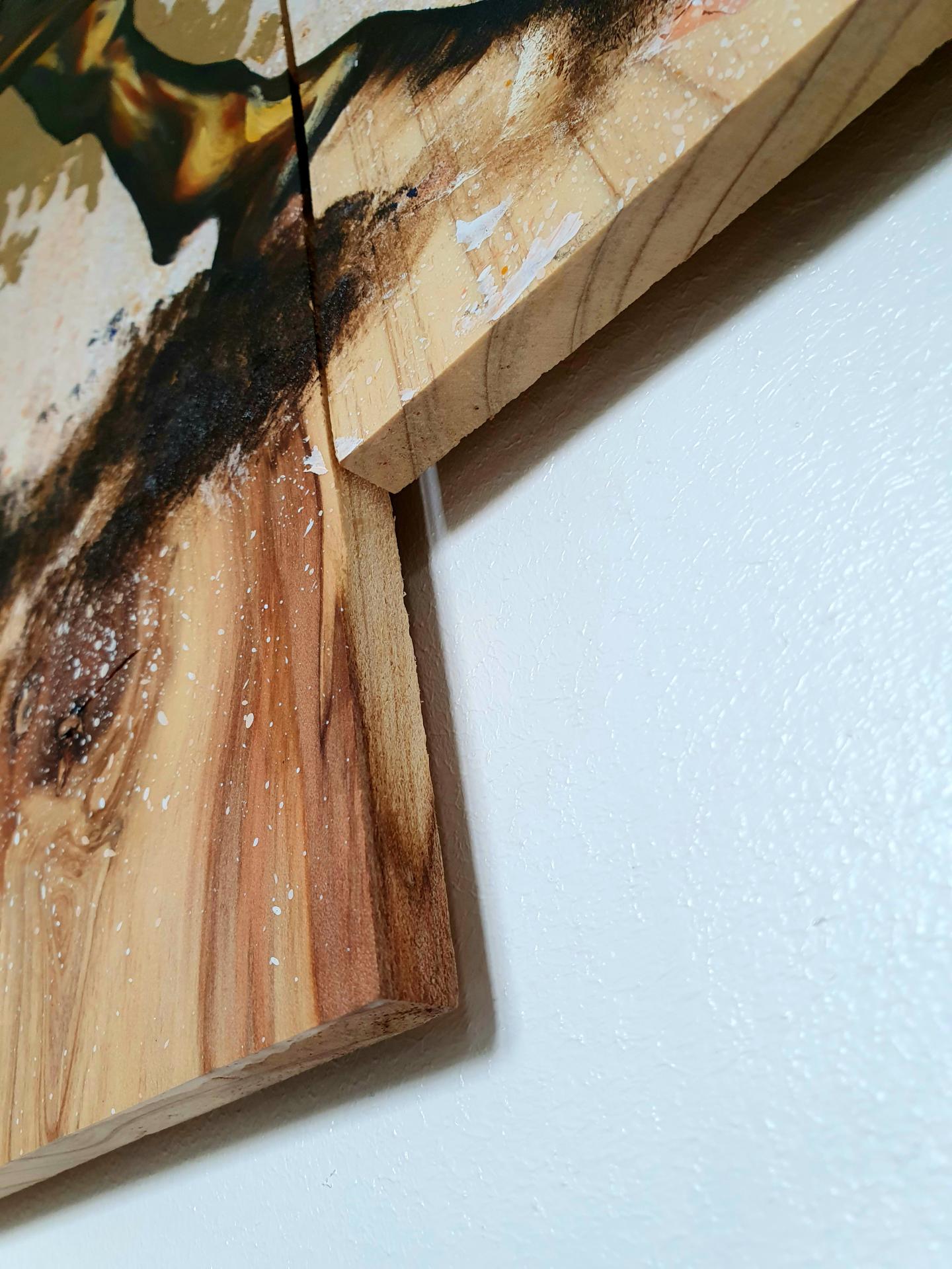 Peinture acrylique, peinture alkyde et feuille à dorer sur bois de séquoïa