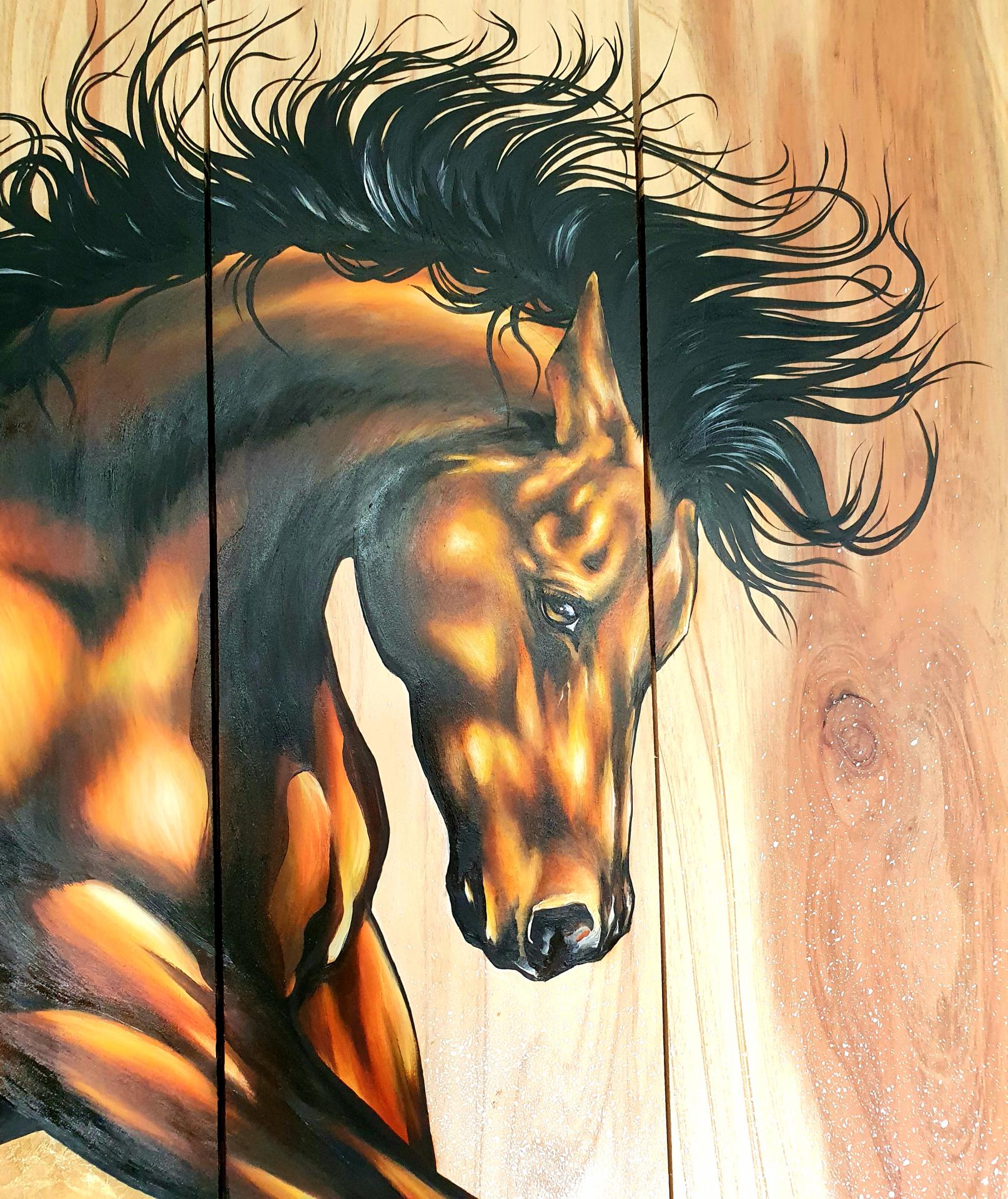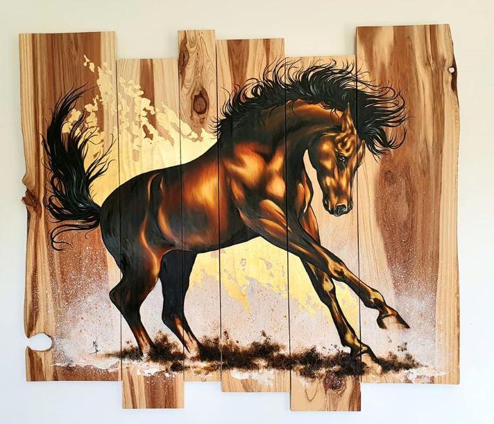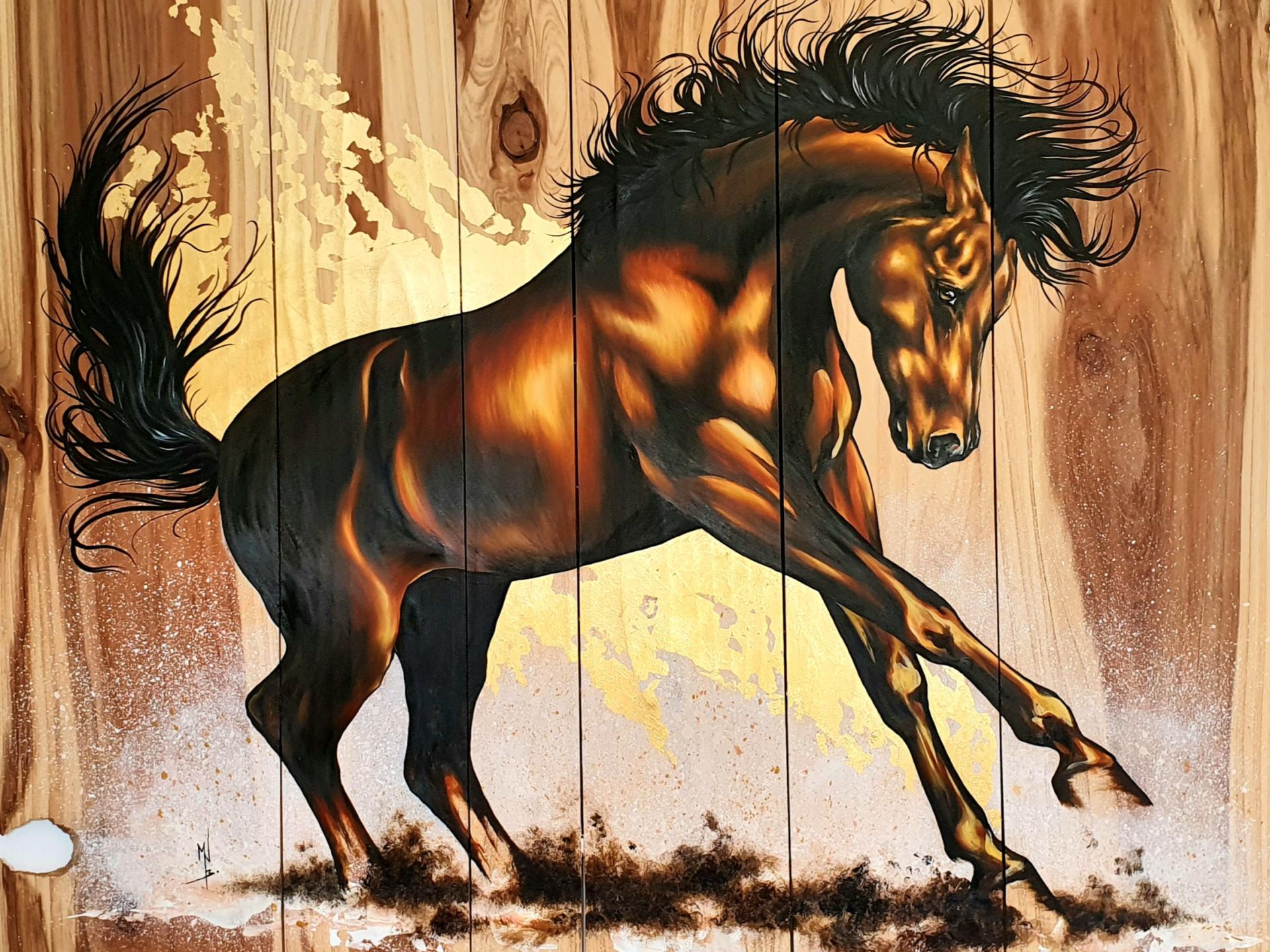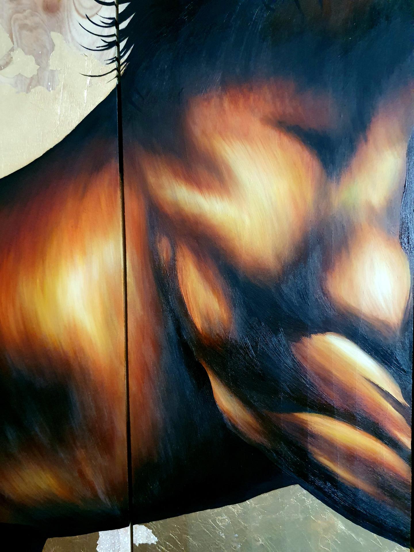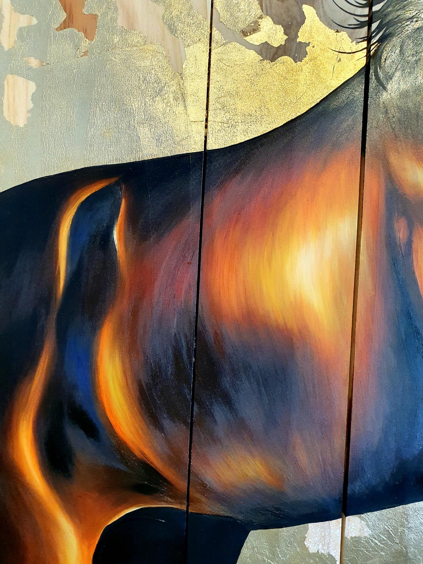 Peinture acrylique, peinture alkyde et feuille à dorer sur bois de séquoïa