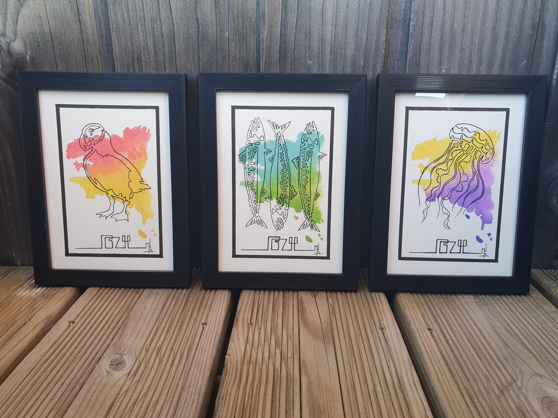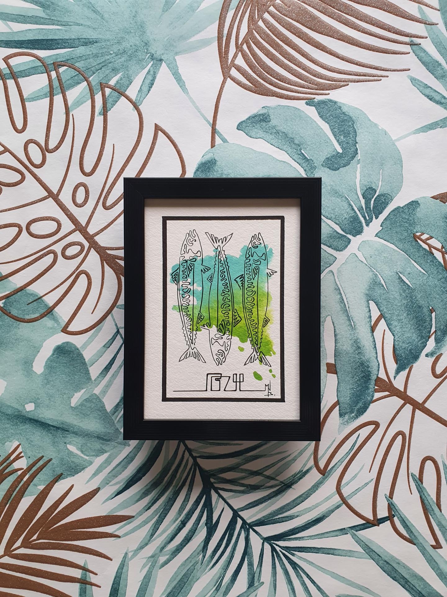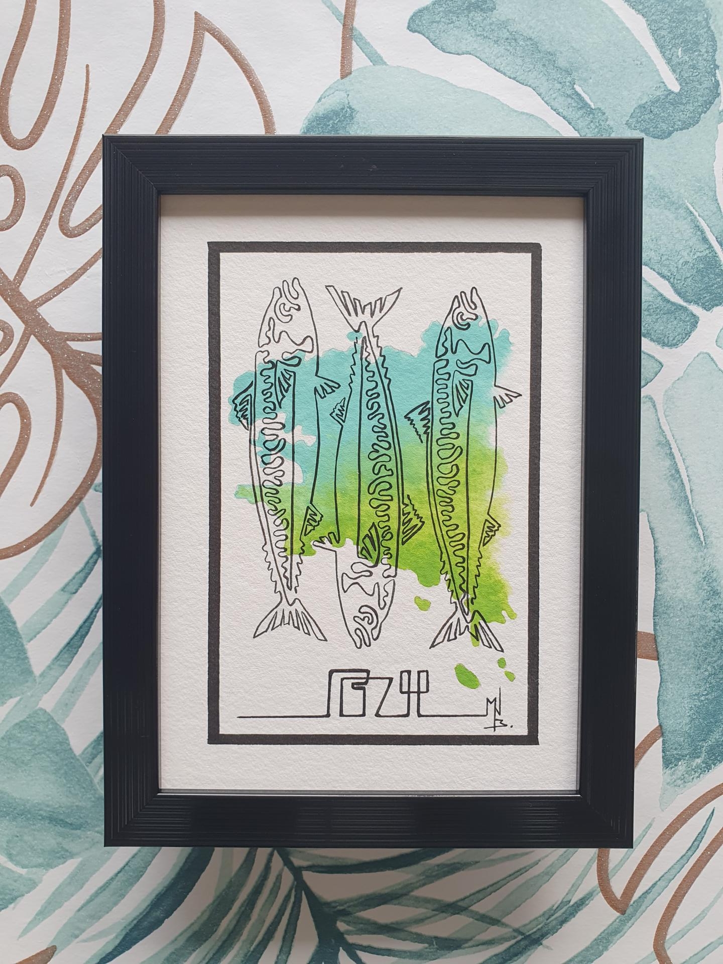 Dessin animalier réalisé en 1 seul trait représentant des maquereaux de Bretagne