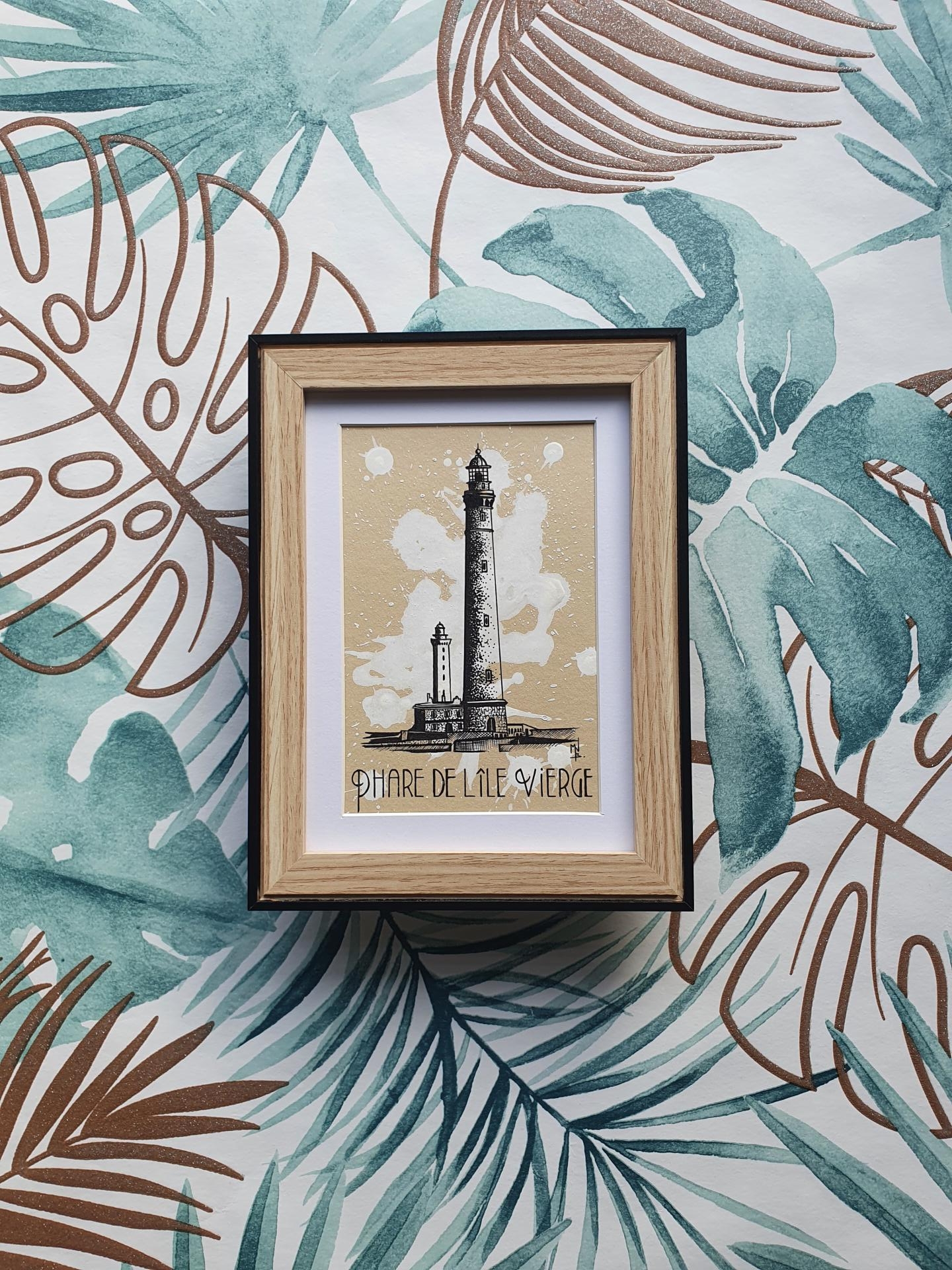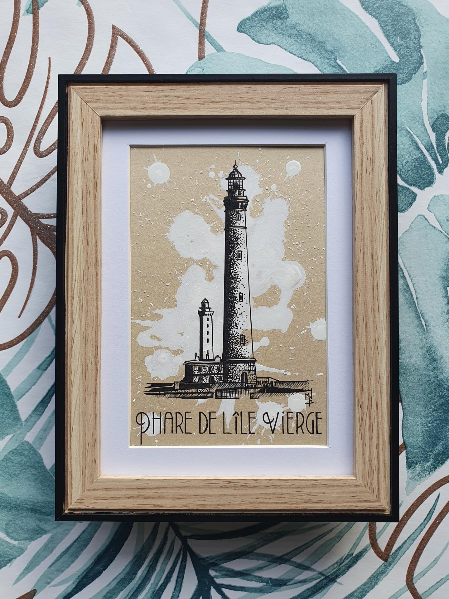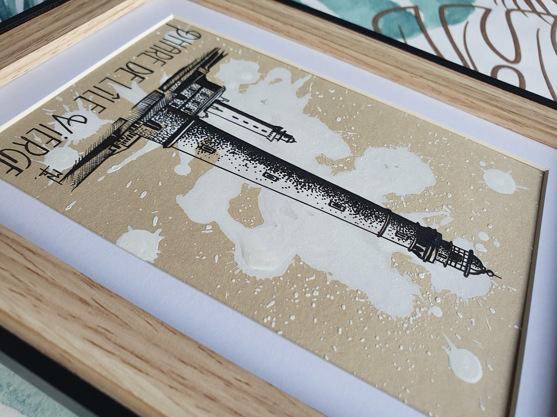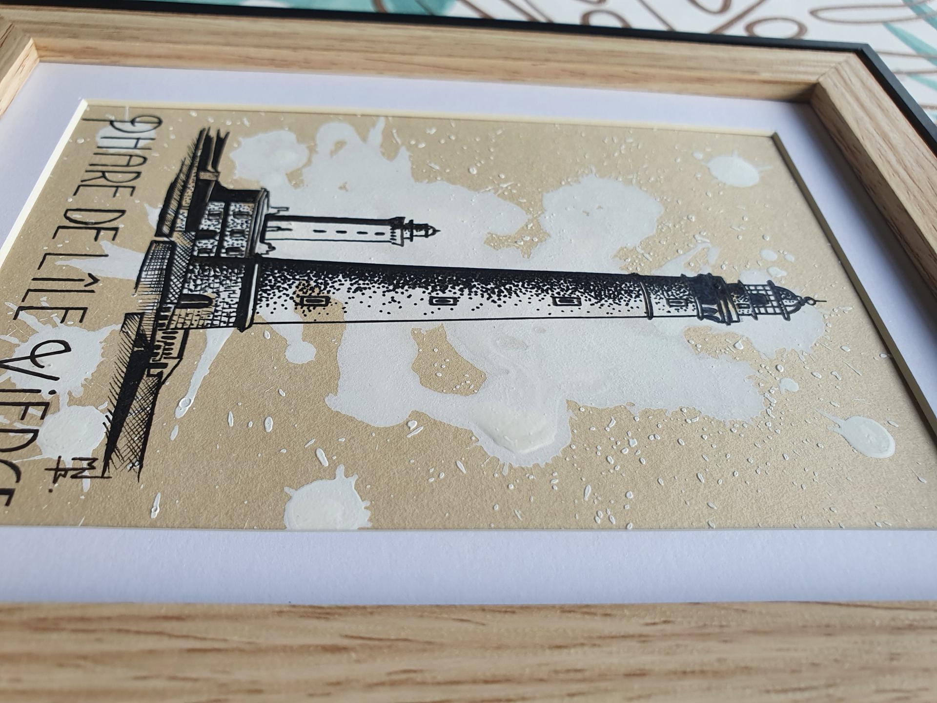 Sur fond de taches blanches, Dessin du phare de l'Ile Vierge de Bretagne