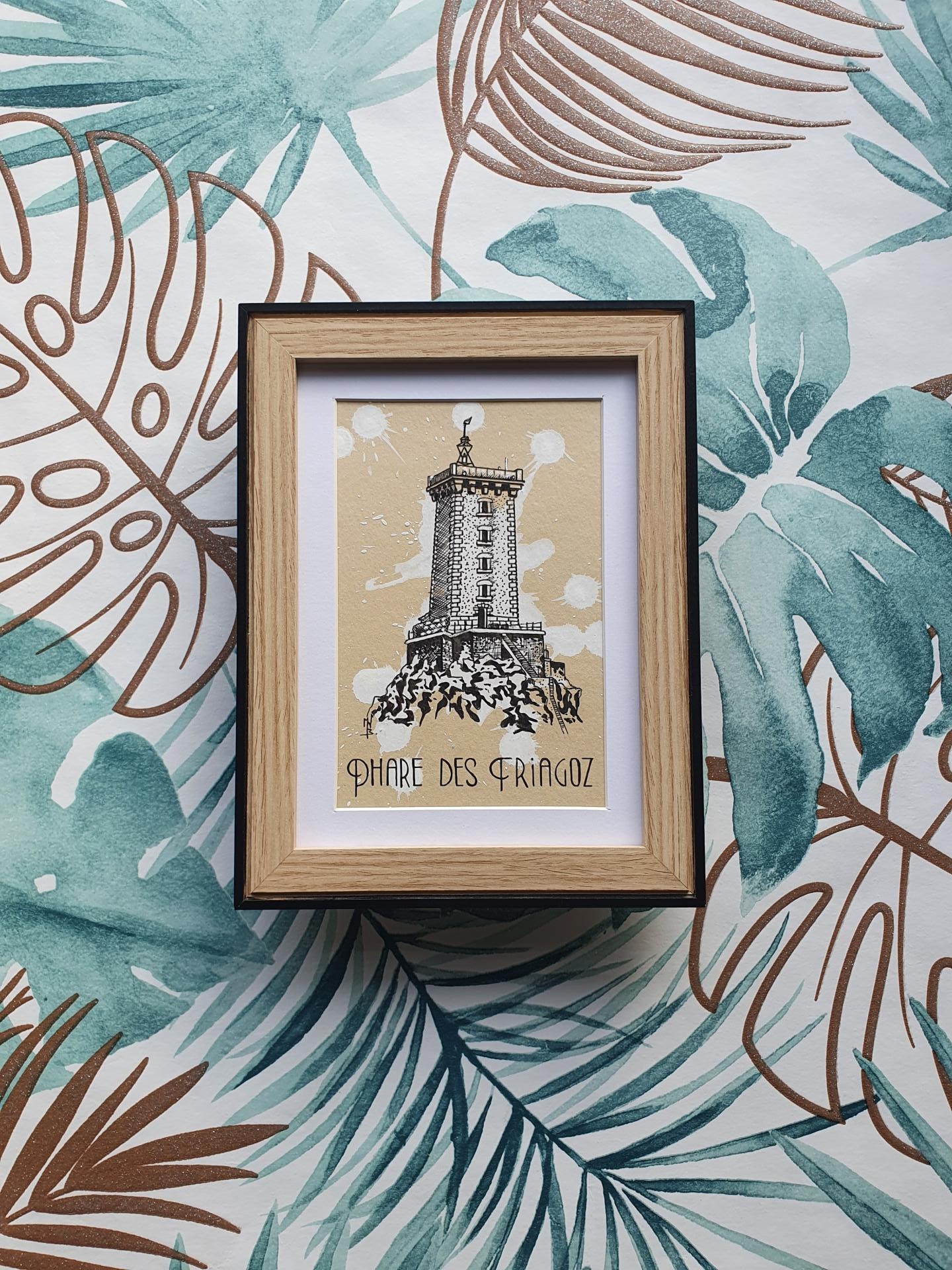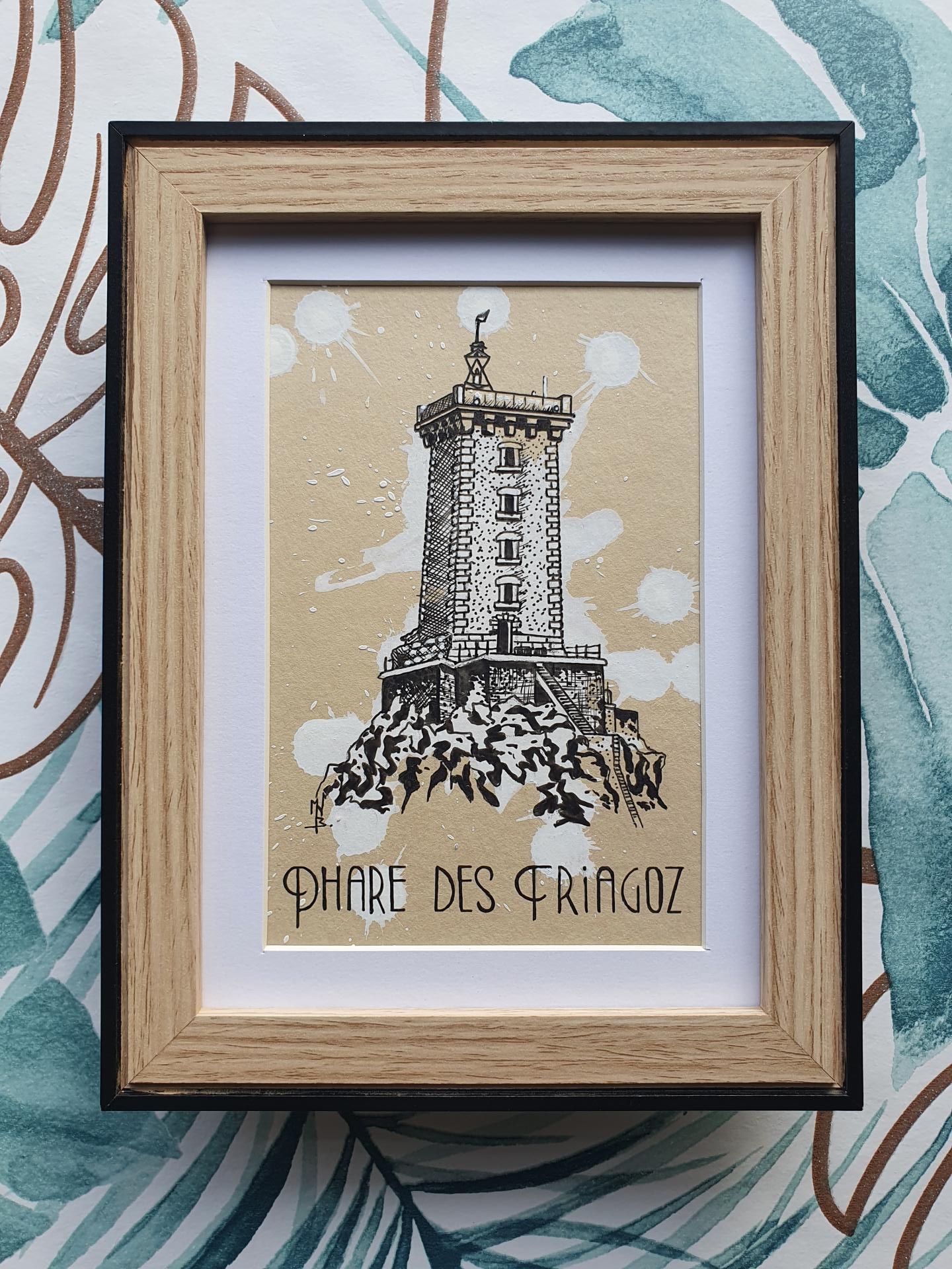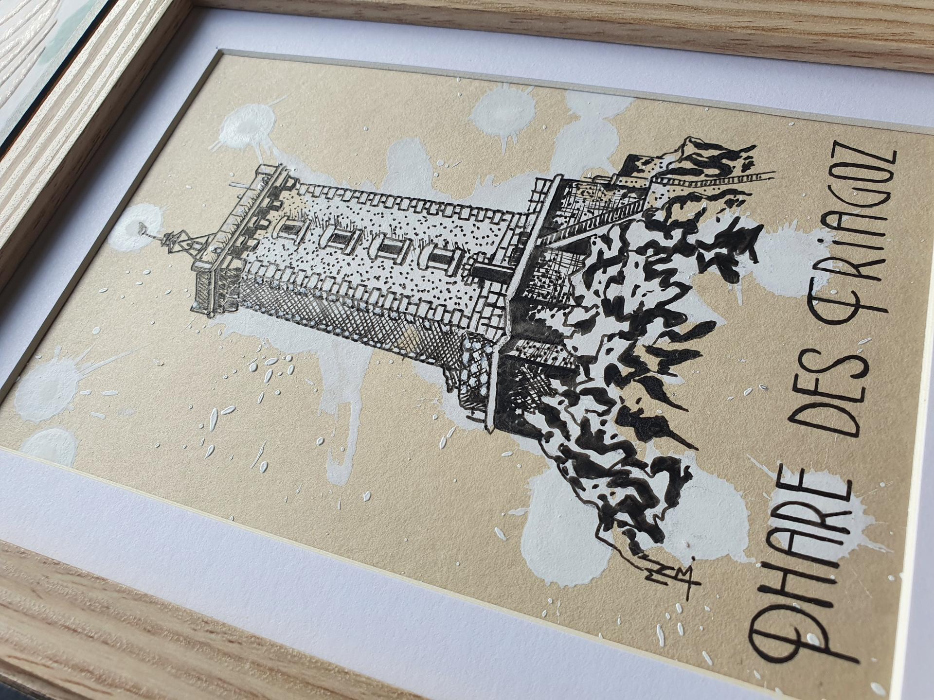 Sur fond de taches blanches, Dessin du phare des Triagoz de Bretagne