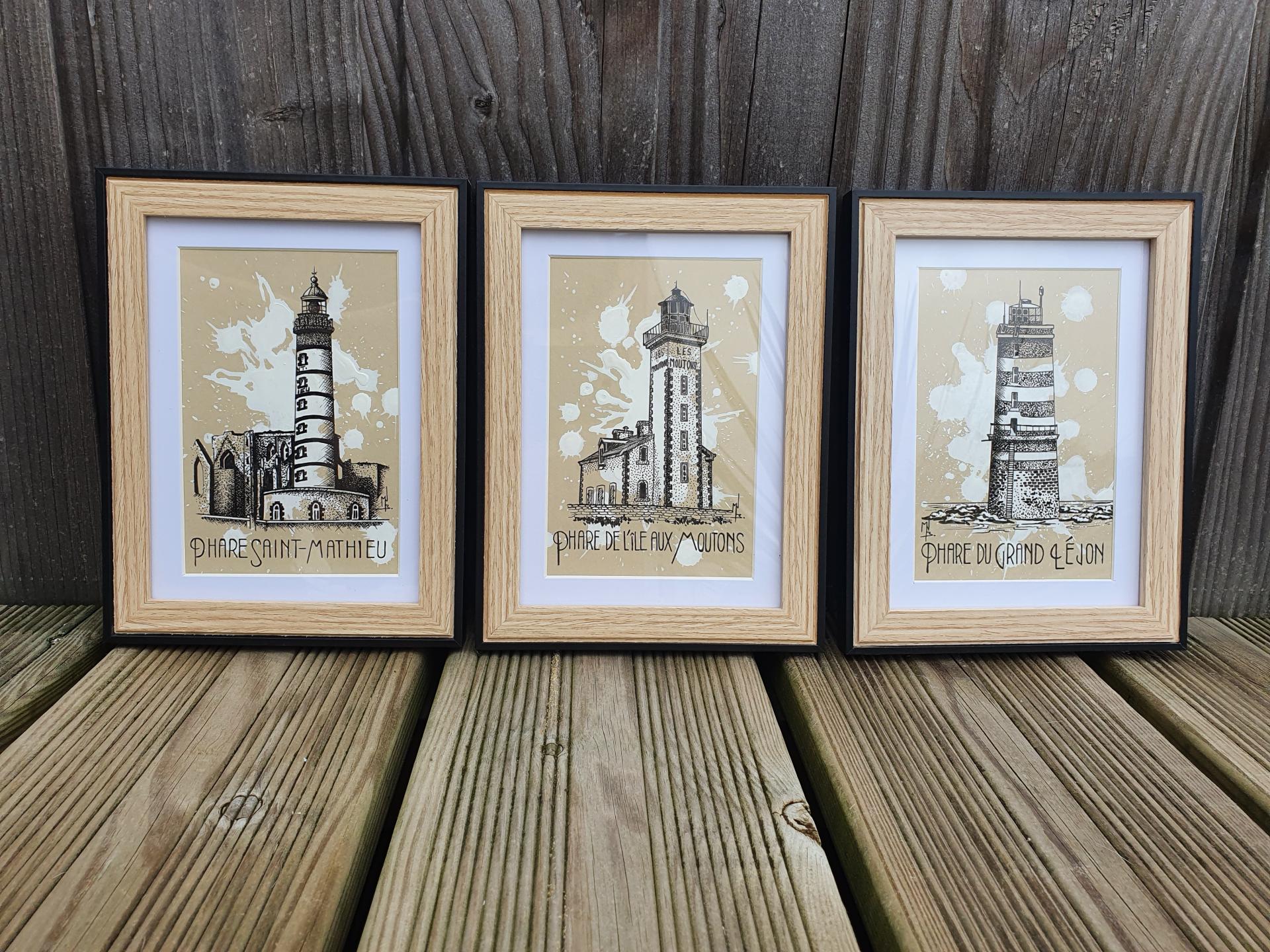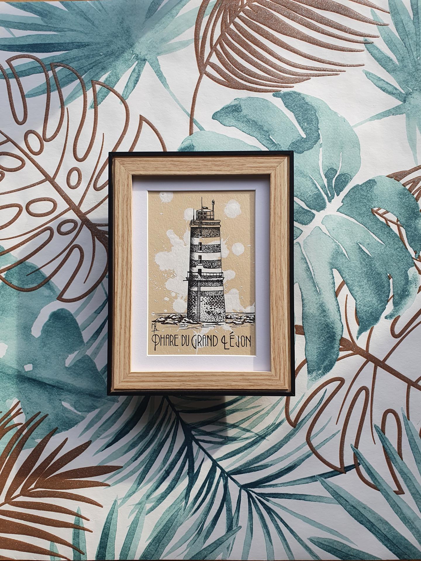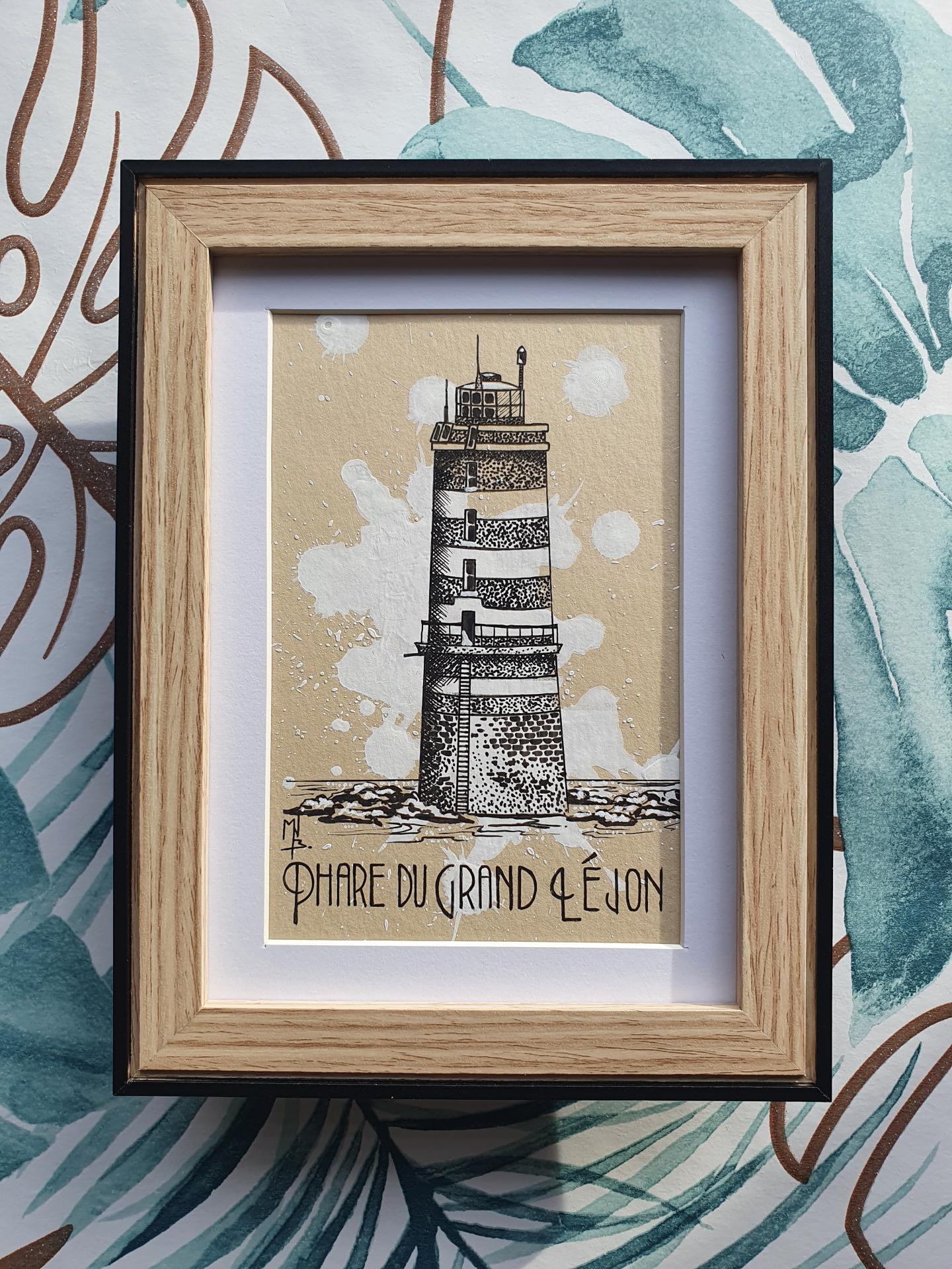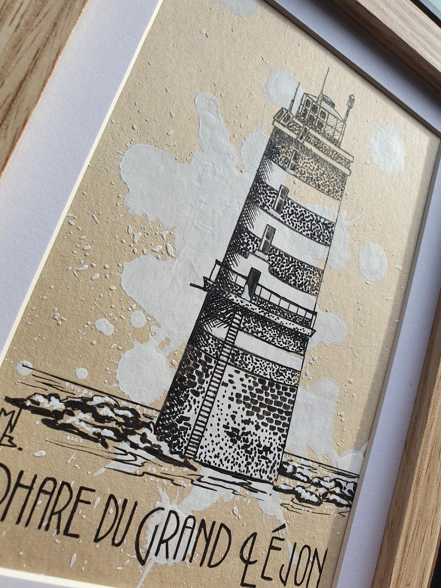 Sur fond de taches blanches, Dessin du phare Du Grand Léjon de Bretagne