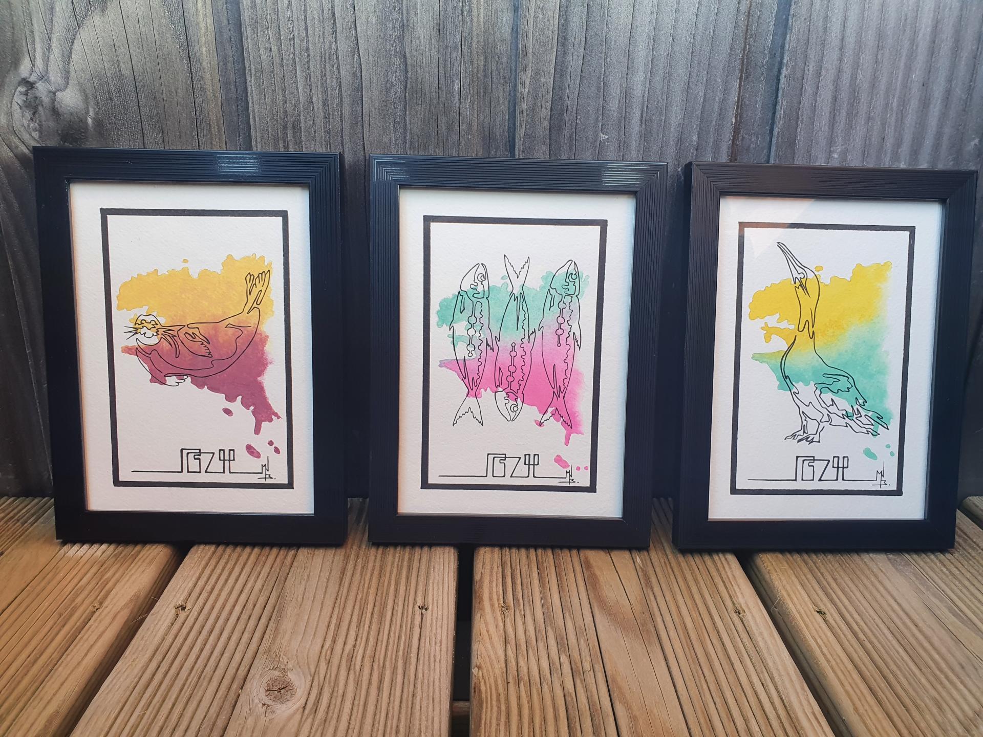 Bretagne en fond coloré, Dessin de phoque en 1 seul trait et Texte BZH en 1 seul trait.
